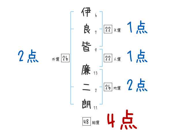 天運![]() | 伊良皆廉二朗さんの天運は22画の1つ星!努力することが苦手ないっぽう手先が器用。芸術性にも優れる。 家系が持つ宿命的な運勢を表します。祖先から受け継いだ苗字ですので自分の力が及びません。家柄を象徴します。 |