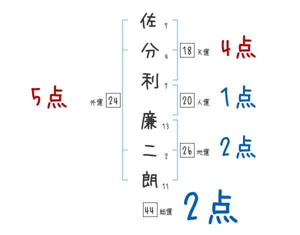 外運![]() | 佐分利廉二朗さんの外運は24画の5つ星!家庭運が良く順調な人生。金運にも恵まれる。 生活面を象徴する運勢です。外部から受ける影響力を表し、結婚運、家庭運や職場、環境への順応性を表します。 |