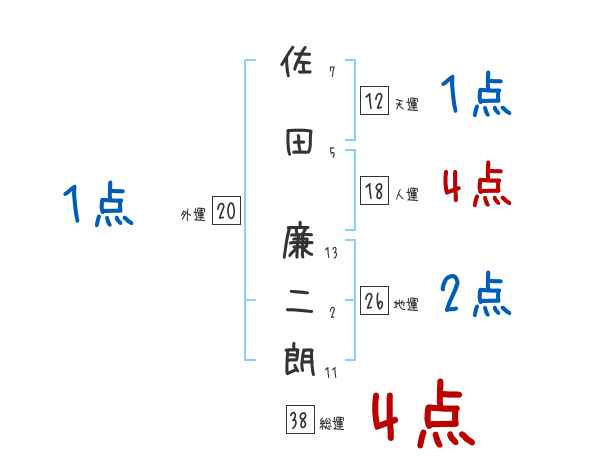 天運![]() | 佐田廉二朗さんの天運は12画の1つ星!簡単な失敗で諦めてしまいやすいかも。着実に行動すると良いでしょう。 家系が持つ宿命的な運勢を表します。祖先から受け継いだ苗字ですので自分の力が及びません。家柄を象徴します。 |