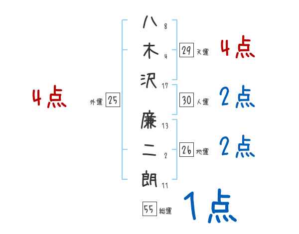 天運![]() | 八木沢廉二朗さんの天運は29画の4つ星!完全主義で才能がある。厳格な心の持ち主。 家系が持つ宿命的な運勢を表します。祖先から受け継いだ苗字ですので自分の力が及びません。家柄を象徴します。 |