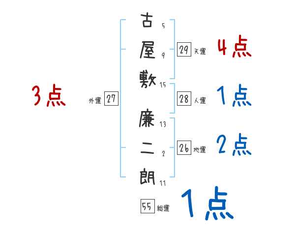 天運![]() | 古屋敷廉二朗さんの天運は29画の4つ星!完全主義で才能がある。厳格な心の持ち主。 家系が持つ宿命的な運勢を表します。祖先から受け継いだ苗字ですので自分の力が及びません。家柄を象徴します。 |