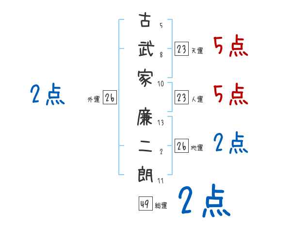 天運![]() | 古武家廉二朗さんの天運は23画の5つ星!想像力に優れ活力がある。一代で成功し名誉を手に入れる。 家系が持つ宿命的な運勢を表します。祖先から受け継いだ苗字ですので自分の力が及びません。家柄を象徴します。 |
