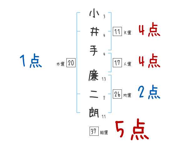 総運![]() | 小井手廉二朗さんの総運は37画の5つ星!努力家で順応性に優れる。現実的な考え方ができ忠実に物事をこなす。 あなたの人生を表す1番重要な運勢です。生涯を通じて影響する総合運となり、主に50歳以降の晩年期に影響を及ぼします。 |