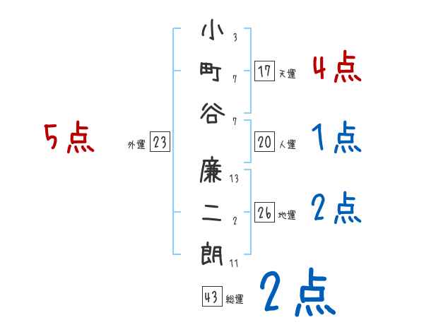 外運![]() | 小町谷廉二朗さんの外運は23画の5つ星!想像力に優れ活力がある。一代で成功し名誉を手に入れる。 生活面を象徴する運勢です。外部から受ける影響力を表し、結婚運、家庭運や職場、環境への順応性を表します。 |