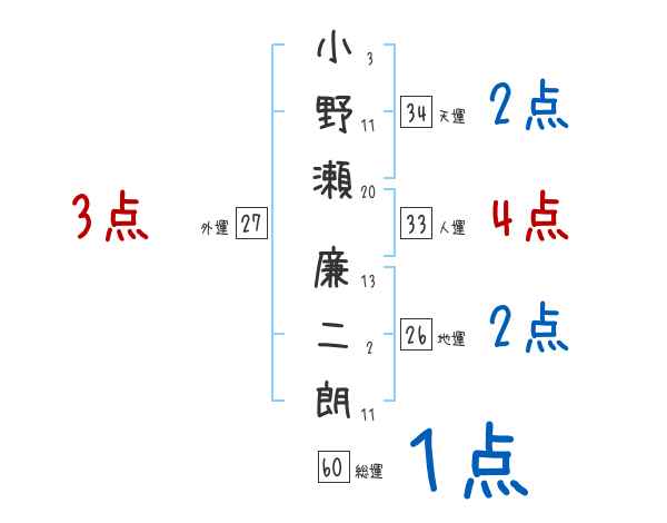 人運![]() | 小野瀬廉二朗さんの人運は33画の4つ星!権力志向でプライドが高い。勇気があり運を切り開き成功する。 性格や才能などを表す2番目に重要な運勢です。人間関係や協調性、社会的な成功に影響します。主に20歳から50歳ぐらいまでの中年期の運勢を表します。 |