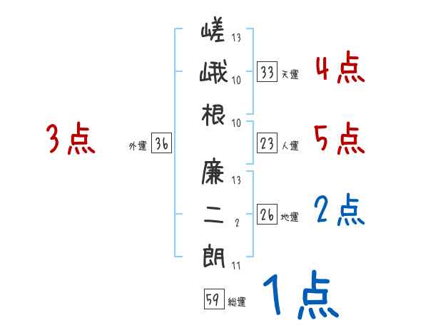 天運![]() | 嵯峨根廉二朗さんの天運は33画の4つ星!権力志向でプライドが高い。勇気があり運を切り開き成功する。 家系が持つ宿命的な運勢を表します。祖先から受け継いだ苗字ですので自分の力が及びません。家柄を象徴します。 |