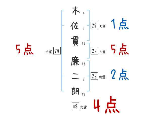 総運![]() | 木佐貫廉二朗さんの総運は48画の4つ星!賢明な性格で人望が厚い。指導力があり多くの人に尊敬される。 あなたの人生を表す1番重要な運勢です。生涯を通じて影響する総合運となり、主に50歳以降の晩年期に影響を及ぼします。 |