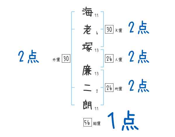 天運![]() | 海老塚廉二朗さんの天運は30画の2つ星!浮き沈みの激しさに注意しましょう。 家系が持つ宿命的な運勢を表します。祖先から受け継いだ苗字ですので自分の力が及びません。家柄を象徴します。 |