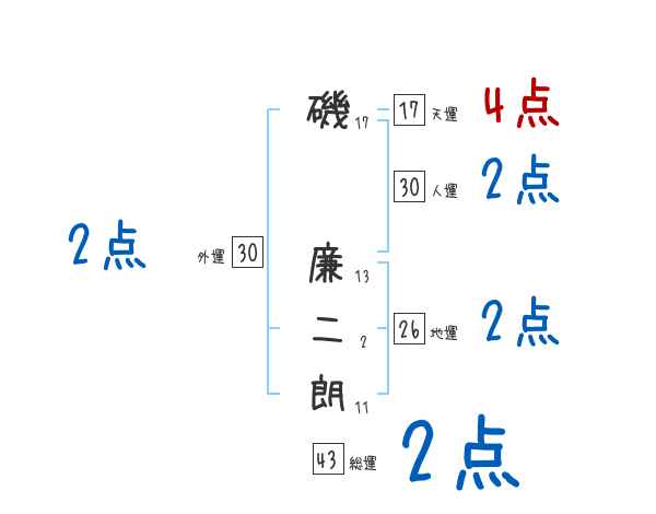 外運![]() | 磯廉二朗さんの外運は30画の2つ星!浮き沈みの激しさに注意しましょう。 生活面を象徴する運勢です。外部から受ける影響力を表し、結婚運、家庭運や職場、環境への順応性を表します。 |