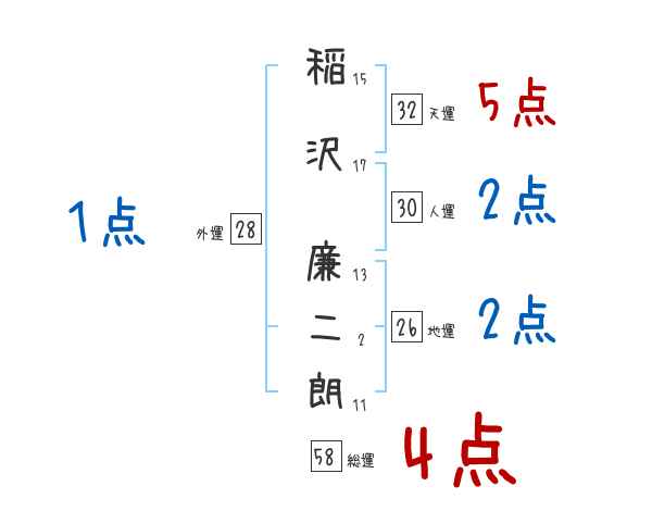 天運![]() | 稲沢廉二朗さんの天運は32画の5つ星!柔軟性があり成功する。チャンスが多く金運が良い。 家系が持つ宿命的な運勢を表します。祖先から受け継いだ苗字ですので自分の力が及びません。家柄を象徴します。 |