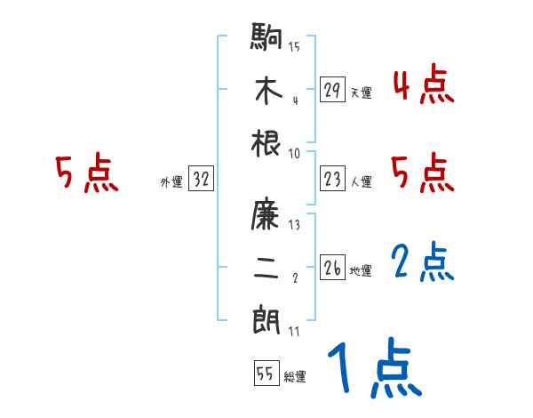外運![]() | 駒木根廉二朗さんの外運は32画の5つ星!柔軟性があり成功する。チャンスが多く金運が良い。 生活面を象徴する運勢です。外部から受ける影響力を表し、結婚運、家庭運や職場、環境への順応性を表します。 |