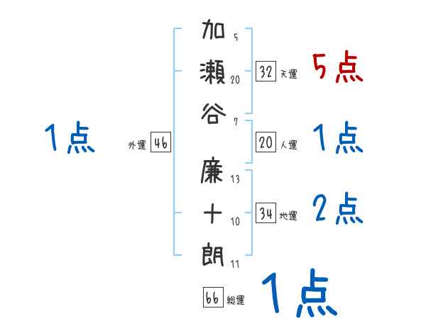 天運![]() | 加瀬谷廉十朗さんの天運は32画の5つ星!柔軟性があり成功する。チャンスが多く金運が良い。 家系が持つ宿命的な運勢を表します。祖先から受け継いだ苗字ですので自分の力が及びません。家柄を象徴します。 |