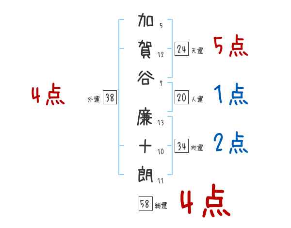 総運![]() | 加賀谷廉十朗さんの総運は58画の4つ星!安定した生活。大器晩成タイプ。 あなたの人生を表す1番重要な運勢です。生涯を通じて影響する総合運となり、主に50歳以降の晩年期に影響を及ぼします。 |