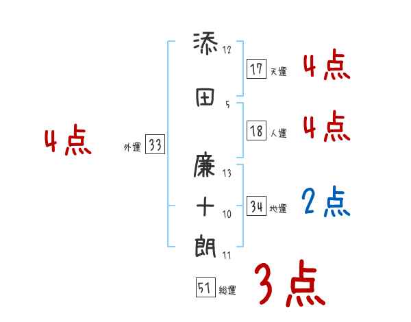 外運![]() | 添田廉十朗さんの外運は33画の4つ星!権力志向でプライドが高い。勇気があり運を切り開き成功する。 生活面を象徴する運勢です。外部から受ける影響力を表し、結婚運、家庭運や職場、環境への順応性を表します。 |