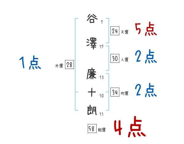 総運![]() | 谷澤廉十朗さんの総運は58画の4つ星!安定した生活。大器晩成タイプ。 あなたの人生を表す1番重要な運勢です。生涯を通じて影響する総合運となり、主に50歳以降の晩年期に影響を及ぼします。 |