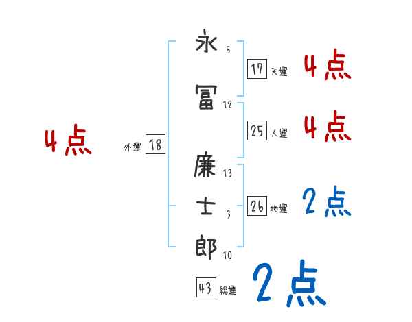 天運![]() | 永冨廉士郎さんの天運は17画の4つ星!積極的な行動力。地位を気づき財産を手に入れる。純粋な心と直感力。 家系が持つ宿命的な運勢を表します。祖先から受け継いだ苗字ですので自分の力が及びません。家柄を象徴します。 |