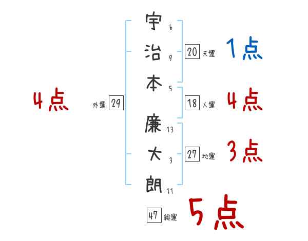 総運![]() | 宇治本廉大朗さんの総運は47画の5つ星!実力が開花し発展する円満な人生。財に恵まれる。 あなたの人生を表す1番重要な運勢です。生涯を通じて影響する総合運となり、主に50歳以降の晩年期に影響を及ぼします。 |
