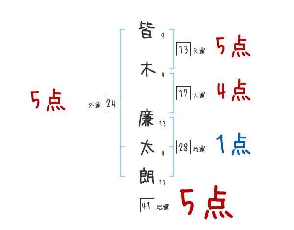 外運![]() | 皆木廉太朗さんの外運は24画の5つ星!家庭運が良く順調な人生。金運にも恵まれる。 生活面を象徴する運勢です。外部から受ける影響力を表し、結婚運、家庭運や職場、環境への順応性を表します。 |