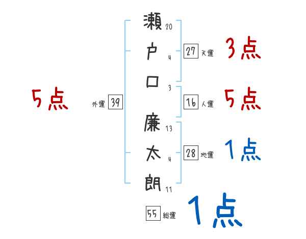 外運![]() | 瀬戸口廉太朗さんの外運は39画の5つ星!社交性に優れ人望が厚い。人の上に立ち成功する。 生活面を象徴する運勢です。外部から受ける影響力を表し、結婚運、家庭運や職場、環境への順応性を表します。 |