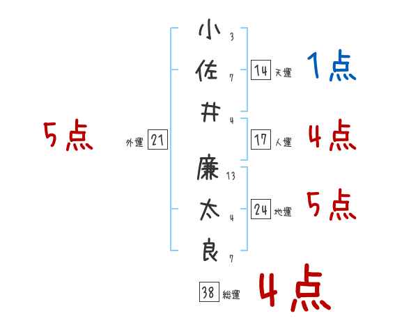 外運![]() | 小佐井廉太良さんの外運は21画の5つ星!統率力がある。独立し成功する。名誉を手に入れる。 生活面を象徴する運勢です。外部から受ける影響力を表し、結婚運、家庭運や職場、環境への順応性を表します。 |
