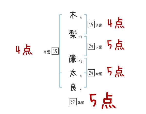 外運![]() | 木梨廉太良さんの外運は15画の4つ星!人徳があり出世する。順調に物事を進め円満な人生。 生活面を象徴する運勢です。外部から受ける影響力を表し、結婚運、家庭運や職場、環境への順応性を表します。 |
