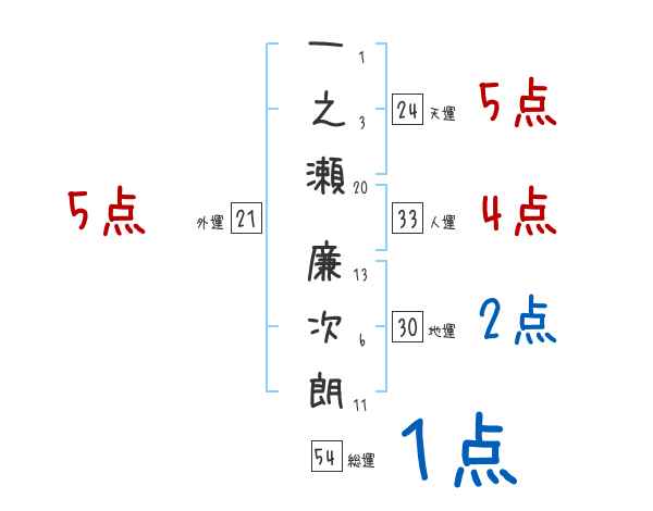 外運![]() | 一之瀬廉次朗さんの外運は21画の5つ星!統率力がある。独立し成功する。名誉を手に入れる。 生活面を象徴する運勢です。外部から受ける影響力を表し、結婚運、家庭運や職場、環境への順応性を表します。 |