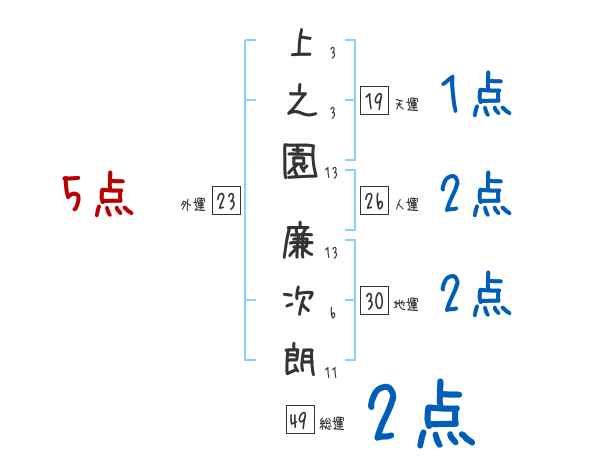 外運![]() | 上之園廉次朗さんの外運は23画の5つ星!想像力に優れ活力がある。一代で成功し名誉を手に入れる。 生活面を象徴する運勢です。外部から受ける影響力を表し、結婚運、家庭運や職場、環境への順応性を表します。 |