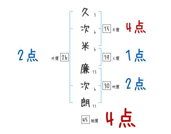 外運![]() | 久次米廉次朗さんの外運は26画の2つ星!波瀾万丈かも。信頼できる人を大事にしましょう。 生活面を象徴する運勢です。外部から受ける影響力を表し、結婚運、家庭運や職場、環境への順応性を表します。 |