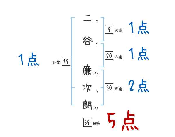 天運![]() | 二谷廉次朗さんの天運は9画の1つ星!消極的で才能を発揮することが苦手なことも。周りの意見に耳を傾けましょう。 家系が持つ宿命的な運勢を表します。祖先から受け継いだ苗字ですので自分の力が及びません。家柄を象徴します。 |