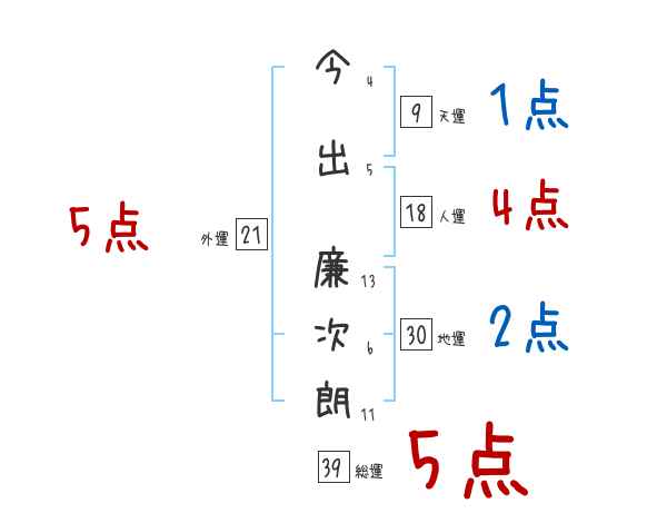 総運![]() | 今出廉次朗さんの総運は39画の5つ星!社交性に優れ人望が厚い。人の上に立ち成功する。 あなたの人生を表す1番重要な運勢です。生涯を通じて影響する総合運となり、主に50歳以降の晩年期に影響を及ぼします。 |