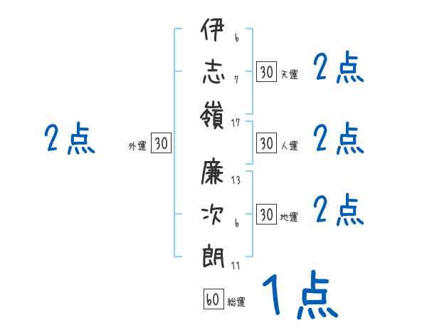 天運![]() | 伊志嶺廉次朗さんの天運は30画の2つ星!浮き沈みの激しさに注意しましょう。 家系が持つ宿命的な運勢を表します。祖先から受け継いだ苗字ですので自分の力が及びません。家柄を象徴します。 |