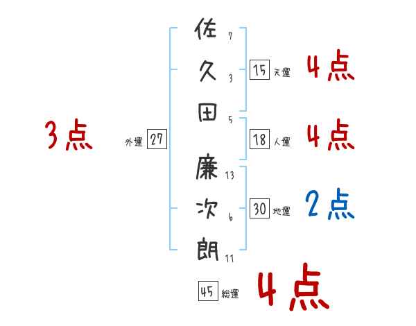 総運![]() | 佐久田廉次朗さんの総運は45画の4つ星!もくもくと物事を進め達成する。地味な努力家。 あなたの人生を表す1番重要な運勢です。生涯を通じて影響する総合運となり、主に50歳以降の晩年期に影響を及ぼします。 |