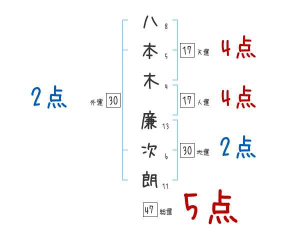 総運![]() | 八本木廉次朗さんの総運は47画の5つ星!実力が開花し発展する円満な人生。財に恵まれる。 あなたの人生を表す1番重要な運勢です。生涯を通じて影響する総合運となり、主に50歳以降の晩年期に影響を及ぼします。 |
