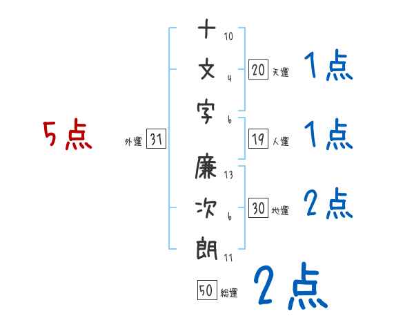 人運![]() | 十文字廉次朗さんの人運は19画の1つ星!優れた才能を持ちますが、協調性が足りないことも。周りの人と協力する事を意識しましょう。 性格や才能などを表す2番目に重要な運勢です。人間関係や協調性、社会的な成功に影響します。主に20歳から50歳ぐらいまでの中年期の運勢を表します。 |
