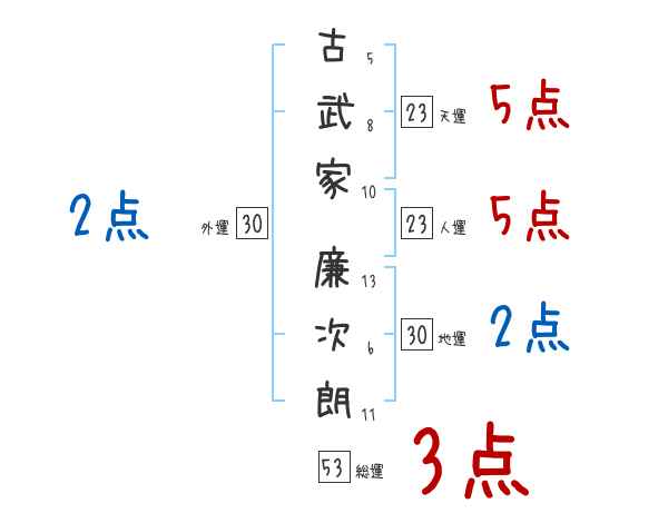 総運![]() | 古武家廉次朗さんの総運は53画の3つ星!やや見栄っ張りで虚栄心がある。散財に注意。 あなたの人生を表す1番重要な運勢です。生涯を通じて影響する総合運となり、主に50歳以降の晩年期に影響を及ぼします。 |