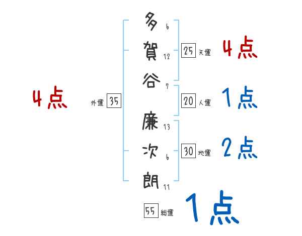 外運![]() | 多賀谷廉次朗さんの外運は35画の4つ星!温厚な性格で感受性が高い。穏和な性格で人望が厚い。 生活面を象徴する運勢です。外部から受ける影響力を表し、結婚運、家庭運や職場、環境への順応性を表します。 |
