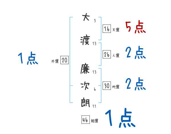 天運![]() | 大渡廉次朗さんの天運は16画の5つ星!人望が厚く大きく発展する。逆転成功が見える。 家系が持つ宿命的な運勢を表します。祖先から受け継いだ苗字ですので自分の力が及びません。家柄を象徴します。 |