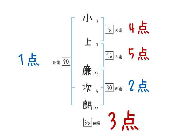 総運![]() | 小上廉次朗さんの総運は36画の3つ星!先見性が豊かです。多少神経質で苦労することも。 あなたの人生を表す1番重要な運勢です。生涯を通じて影響する総合運となり、主に50歳以降の晩年期に影響を及ぼします。 |