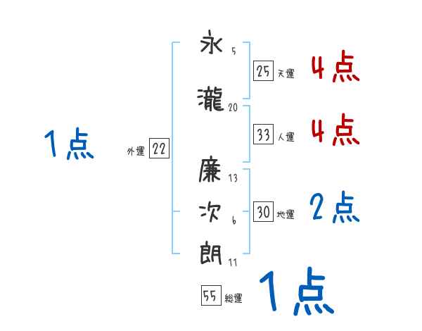 天運![]() | 永瀧廉次朗さんの天運は25画の4つ星!個性があり才能があふれる。強運の持ち主で発展する。 家系が持つ宿命的な運勢を表します。祖先から受け継いだ苗字ですので自分の力が及びません。家柄を象徴します。 |
