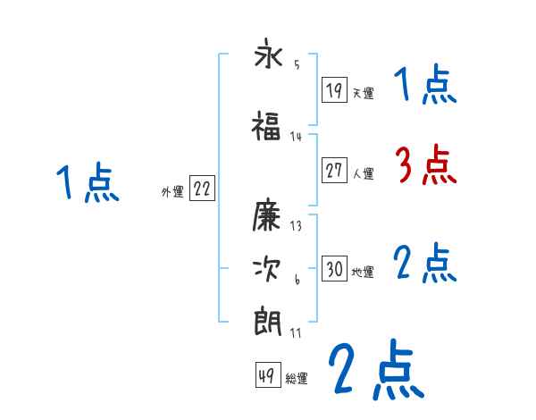天運![]() | 永福廉次朗さんの天運は19画の1つ星!優れた才能を持ちますが、協調性が足りないことも。周りの人と協力する事を意識しましょう。 家系が持つ宿命的な運勢を表します。祖先から受け継いだ苗字ですので自分の力が及びません。家柄を象徴します。 |