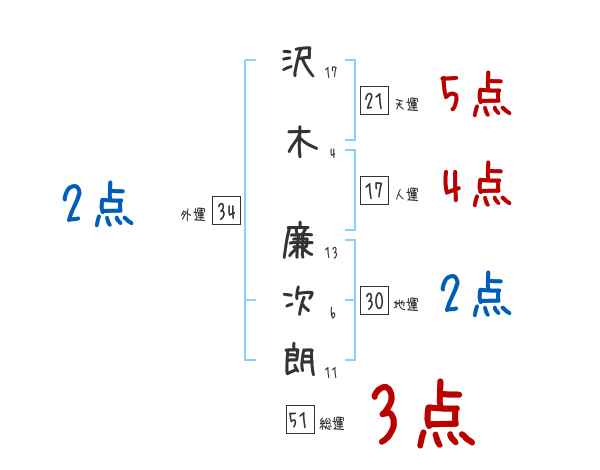 天運![]() | 沢木廉次朗さんの天運は21画の5つ星!統率力がある。独立し成功する。名誉を手に入れる。 家系が持つ宿命的な運勢を表します。祖先から受け継いだ苗字ですので自分の力が及びません。家柄を象徴します。 |