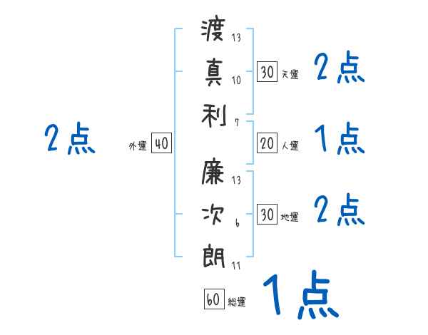 天運![]() | 渡真利廉次朗さんの天運は30画の2つ星!浮き沈みの激しさに注意しましょう。 家系が持つ宿命的な運勢を表します。祖先から受け継いだ苗字ですので自分の力が及びません。家柄を象徴します。 |