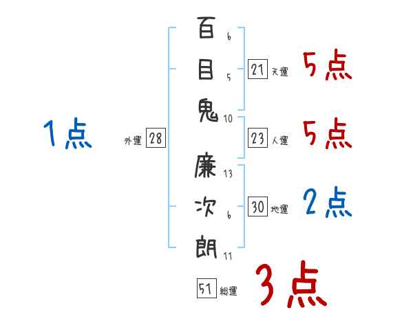 天運![]() | 百目鬼廉次朗さんの天運は21画の5つ星!統率力がある。独立し成功する。名誉を手に入れる。 家系が持つ宿命的な運勢を表します。祖先から受け継いだ苗字ですので自分の力が及びません。家柄を象徴します。 |