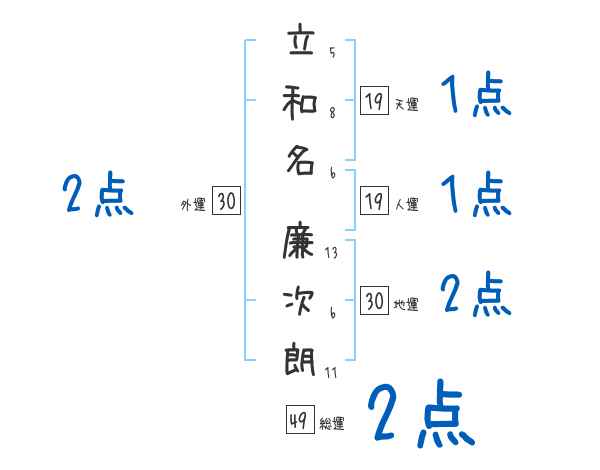 総運![]() | 立和名廉次朗さんの総運は49画の2つ星!不安定な性格で明暗がある人生。周りの人には支援されやすい。 あなたの人生を表す1番重要な運勢です。生涯を通じて影響する総合運となり、主に50歳以降の晩年期に影響を及ぼします。 |