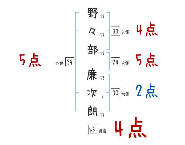 外運![]() | 野々部廉次朗さんの外運は39画の5つ星!社交性に優れ人望が厚い。人の上に立ち成功する。 生活面を象徴する運勢です。外部から受ける影響力を表し、結婚運、家庭運や職場、環境への順応性を表します。 |