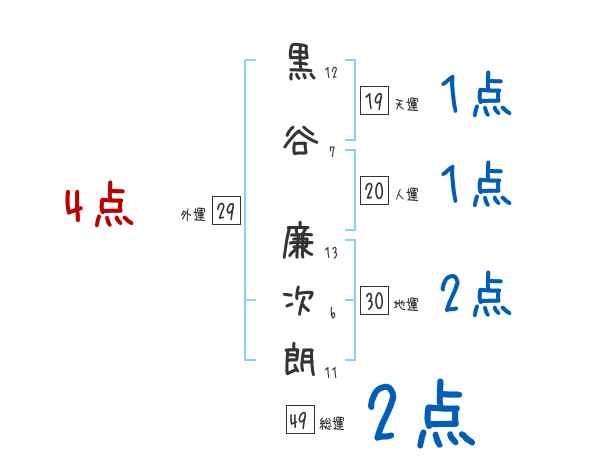 天運![]() | 黒谷廉次朗さんの天運は19画の1つ星!優れた才能を持ちますが、協調性が足りないことも。周りの人と協力する事を意識しましょう。 家系が持つ宿命的な運勢を表します。祖先から受け継いだ苗字ですので自分の力が及びません。家柄を象徴します。 |