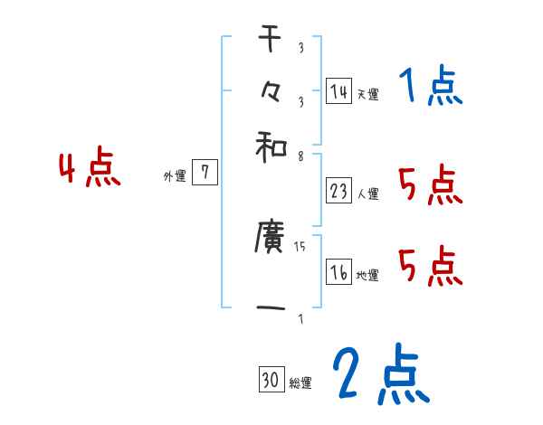総運![]() | 千々和廣一さんの総運は30画の2つ星!浮き沈みの激しさに注意しましょう。 あなたの人生を表す1番重要な運勢です。生涯を通じて影響する総合運となり、主に50歳以降の晩年期に影響を及ぼします。 |