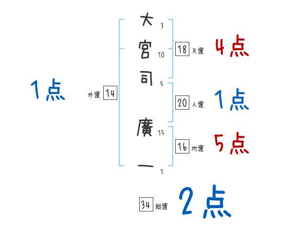 外運![]() | 大宮司廣一さんの外運は14画の1つ星!人に対して優しいがストレスを溜め込みがち。人間関係のトラブルを避けるよう気をつけましょう。 生活面を象徴する運勢です。外部から受ける影響力を表し、結婚運、家庭運や職場、環境への順応性を表します。 |
