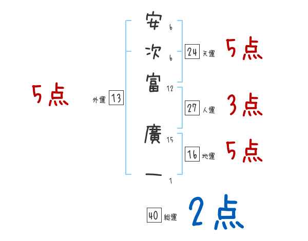 外運![]() | 安次富廣一さんの外運は13画の5つ星!才能に恵まれ人気がある。名声を手に入れる。円満な人生。 生活面を象徴する運勢です。外部から受ける影響力を表し、結婚運、家庭運や職場、環境への順応性を表します。 |