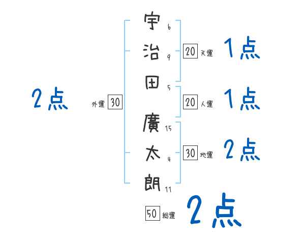 総運![]() | 宇治田廣太朗さんの総運は50画の2つ星!浮き沈みが激しく不安定。しりすぼみに衰退しやすいので注意しましょう。 あなたの人生を表す1番重要な運勢です。生涯を通じて影響する総合運となり、主に50歳以降の晩年期に影響を及ぼします。 |